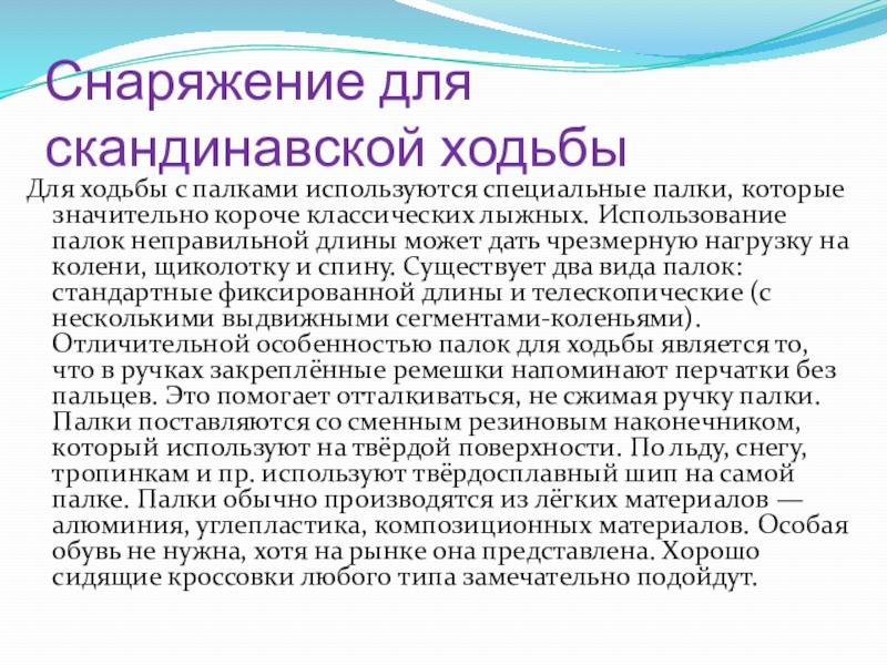 значительно короче классических лыжных. Использование палок неправильной длины может дать чрезмерную нагрузку на колени, щиколотку и спину. Существует два вида палок: стандартные фиксированной длины и телескопические (с несколькими выдвижными сегментами-коленьями). Отличительной особенностью палок для ходьбы является то, что в ручках закреплённые ремешки напоминают перчатки без пальцев. Это помогает отталкиваться, не сжимая ручку палки. Палки поставляются со сменным резиновым наконечником, который используют на твёрдой поверхности. По льду, снегу, тропинкам и пр. используют твёрдосплавный шип на самой палке. Палки обычно производятся из лёгких материалов — алюминия, углепластика, композиционных материалов. Особая обувь не нужна, хотя на рынке она представлена. Хорошо сидящие кроссовки любого типа замечательно подойдут.