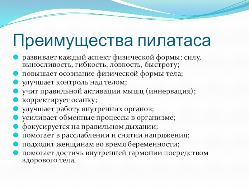 представляет собой комплекс из плавных движений, направленных на улучшение гибкости тела, укрепление отдельных мышц и организма в целом. В процессе занятия работают не только крупные поверхностные мышцы, но и мелкие глубокие, которые требуют особого подхода и специфической тренировки. Помимо сугубо оздоровительного направления, пилатес — восстановительное средство после различных травм, в частности, повреждений позвоночника.