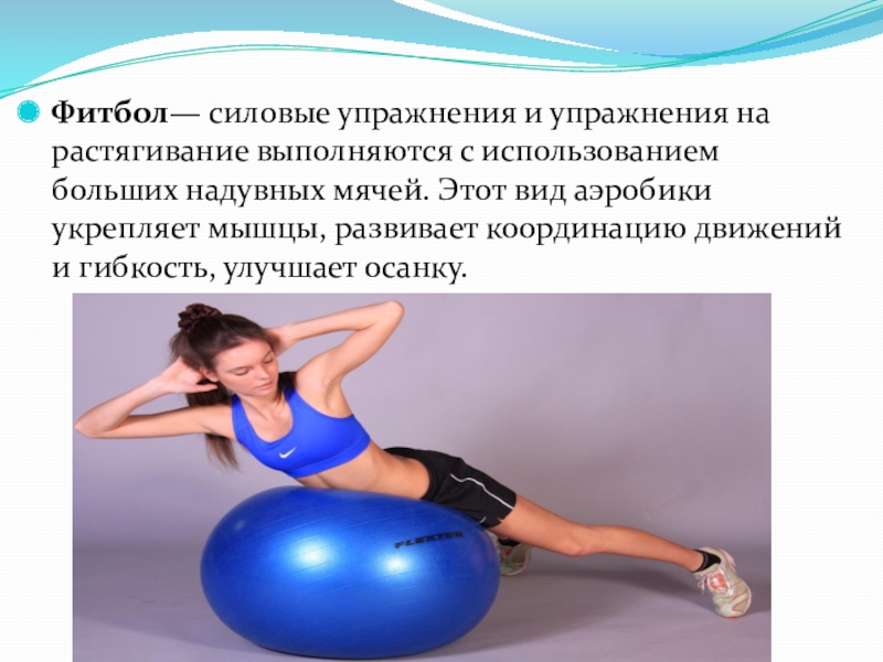 Слайд 14Фитбол— силовые упражнения и упражнения на растягивание выполняются с использованием больших