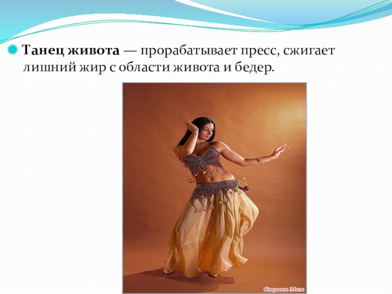 Слайд 8Танец живота — прорабатывает пресс, сжигает лишний жир с области живота и