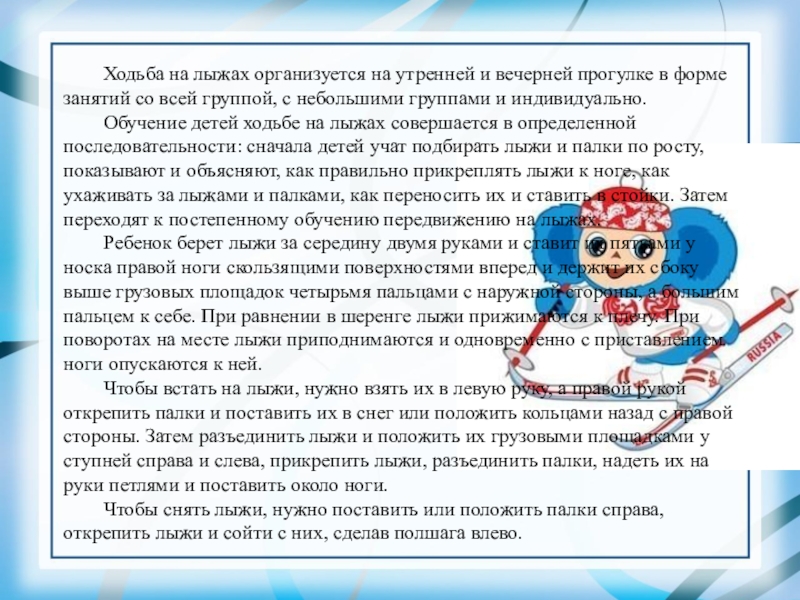 Обучение детей ходьбе на лыжах совершается в определенной последовательности: сначала детей учат подбирать лыжи и палки по росту, показывают и объясняют, как правильно прикреплять лыжи к ноге, как ухаживать за лыжами и палками, как переносить их и ставить в стойки. Затем переходят к постепенному обучению передвижению на лыжах.