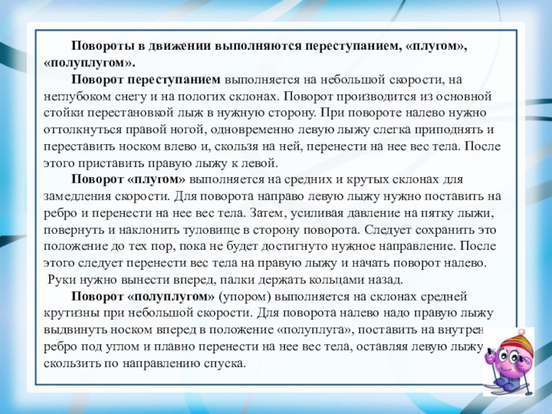 Слайд 15Повороты в движении выполняются переступанием, «плугом», «полуплугом».