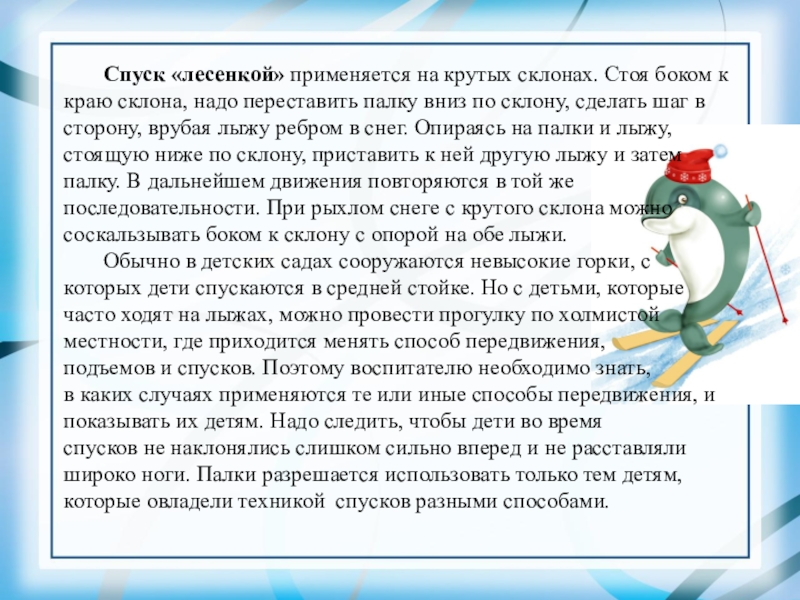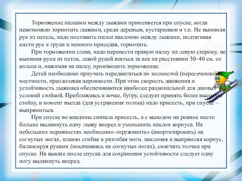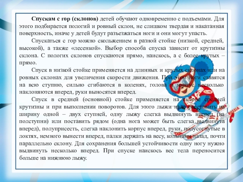 спусков не наклонялись слишком сильно вперед и не расставляли широко ноги. Палки разрешается использовать только тем детям, которые овладели техникой спусков разными способами.