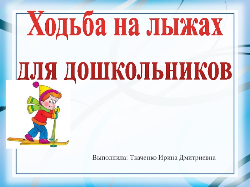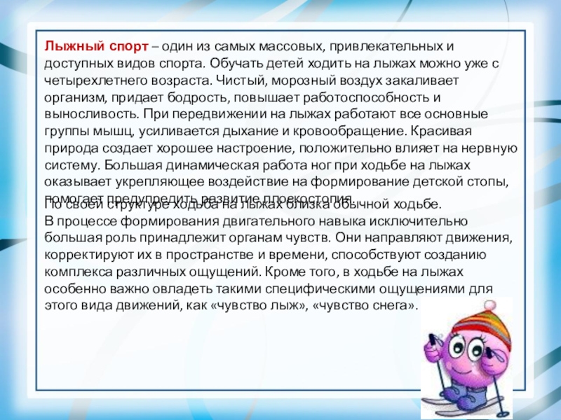 спорта. Обучать детей ходить на лыжах можно уже с четырехлетнего возраста. Чистый, морозный воздух закаливает организм, придает бодрость, повышает работоспособность и выносливость. При передвижении на лыжах работают все основные группы мышц, усиливается дыхание и кровообращение. Красивая природа создает хорошее настроение, положительно влияет на нервную систему. Большая динамическая работа ног при ходьбе на лыжах оказывает укрепляющее воздействие на формирование детской стопы, помогает предупредить развитие плоскостопия.
