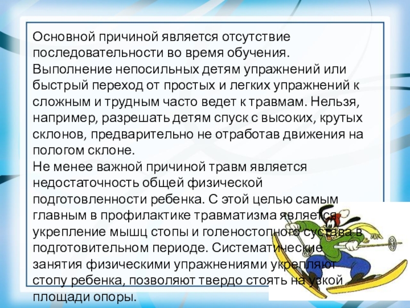 упражнений или быстрый переход от простых и легких упражнений к сложным и трудным часто ведет к травмам. Нельзя, например, разрешать детям спуск с высоких, крутых склонов, предварительно не отработав движения на пологом склоне.