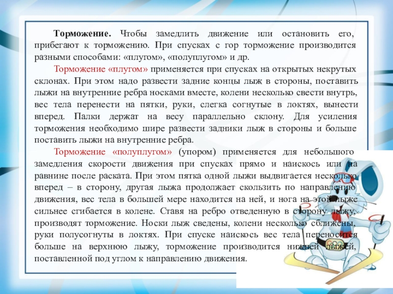 спусках с гор торможение производится разными способами: «плугом», «полуплугом» и др.
