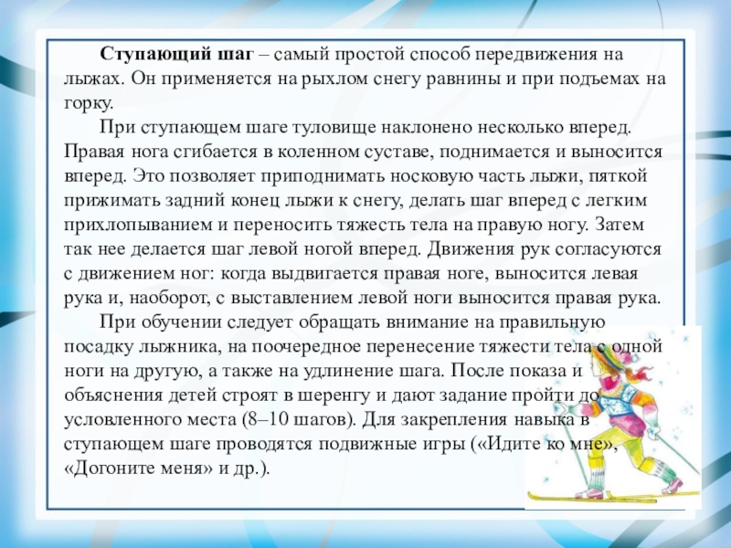 Слайд 10Ступающий шаг – самый простой способ передвижения на лыжах. Он применяется