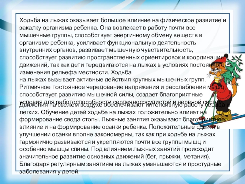 Слайд 6Ходьба на лыжах оказывает большое влияние на физическое развитие и закалку