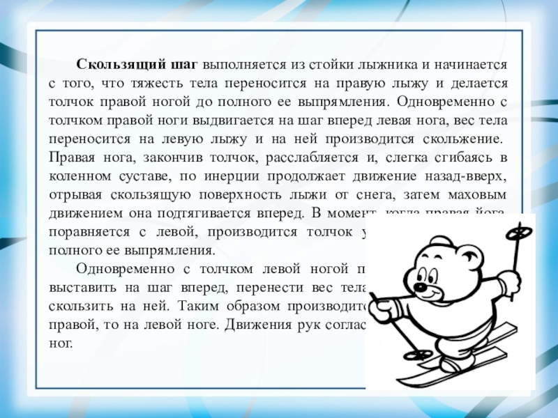 Слайд 11Скользящий шаг выполняется из стойки лыжника и начинается с того, что