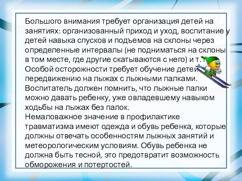 Немаловажное значение в профилактике травматизма имеют одежда и обувь ребенка, которые должны отвечать особенностям лыжных занятий и метеорологическим условиям. Обувь ребенка не должна быть тесной, это предотвратит возможность обморожения и потертостей.