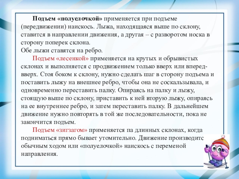Слайд 17Подъем «полуелочкой» применяется при подъеме (передвижении) наискось. Лыжа, находящаяся выше по