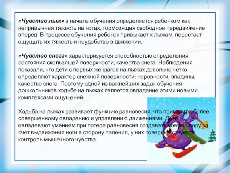 Слайд 4«Чувство лыж» в начале обучения определяется ребенком как непривычная тяжесть на