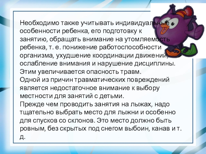 Слайд 25Необходимо также учитывать индивидуальные особенности ребенка, его подготовку к