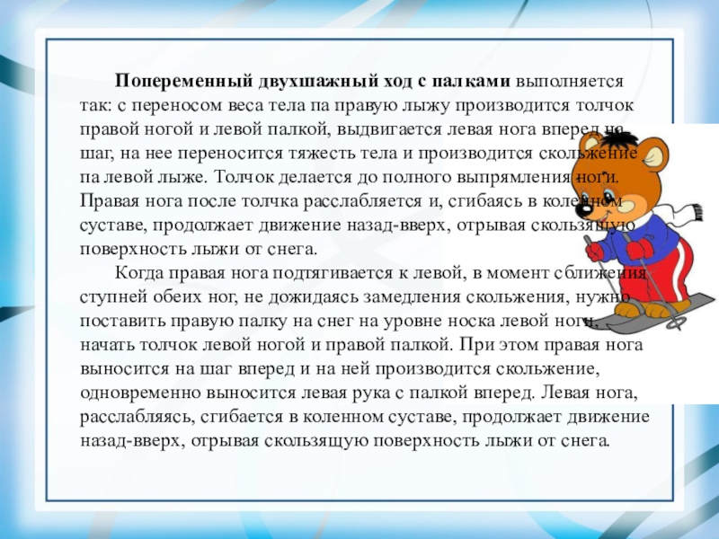 Слайд 12Попеременный двухшажный ход с палками выполняется так: с переносом веса тела
