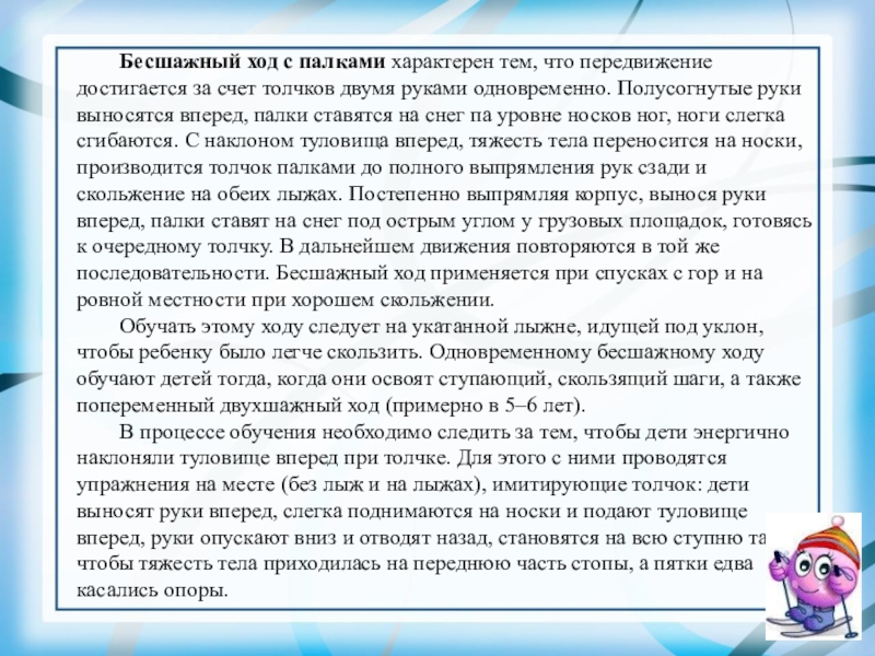 Обучать этому ходу следует на укатанной лыжне, идущей под уклон, чтобы ребенку было легче скользить. Одновременному бесшажному ходу обучают детей тогда, когда они освоят ступающий, скользящий шаги, а также попеременный двухшажный ход (примерно в 5–6 лет).