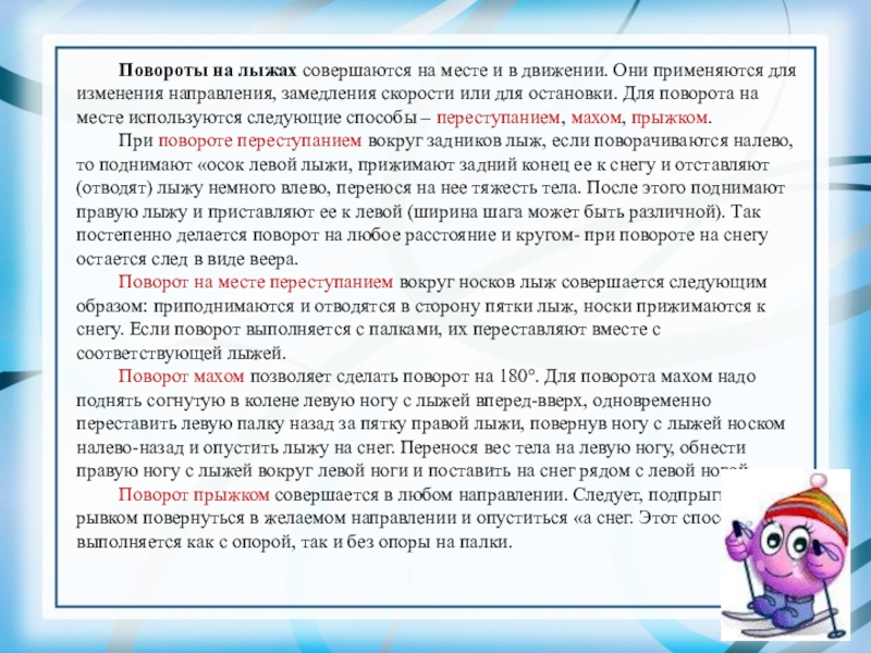 Слайд 14Повороты на лыжах совершаются на месте и в движении. Они применяются