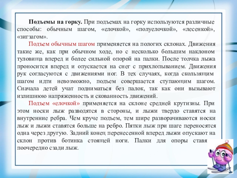 Слайд 16Подъемы на горку. При подъемах на горку используются различные способы: обычным