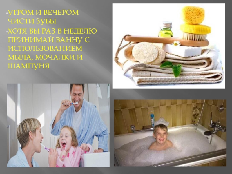 Утром и вечером чисти зубыХотя бы раз в неделю принимай ванну с использованием мыла, мочалки и шампуня