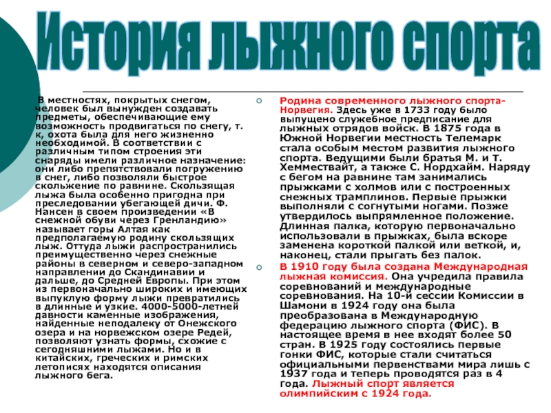 В 1910 году была создана Международная лыжная комиссия. Она учредила правила соревнований и международные соревнования. На 10-й сессии Комиссии в Шамони в 1924 году она была преобразована в Международную федерацию лыжного спорта (ФИС). В настоящее время в нее входят более 50 стран. В 1925 году состоялись первые гонки ФИС, которые стали считаться официальными первенствами мира лишь с 1937 года и теперь проводятся раз в 4 года. Лыжный спорт является олимпийским с 1924 года.