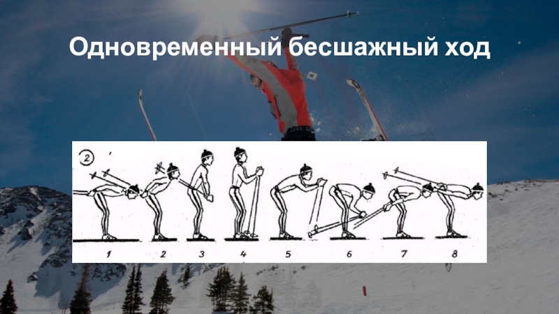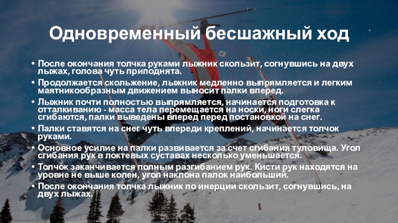 Одновременный бесшажный ходПосле окончания толчка руками лыжник скользит, согнувшись на двух лыжах, голова чуть приподнята. Продолжается скольжение,