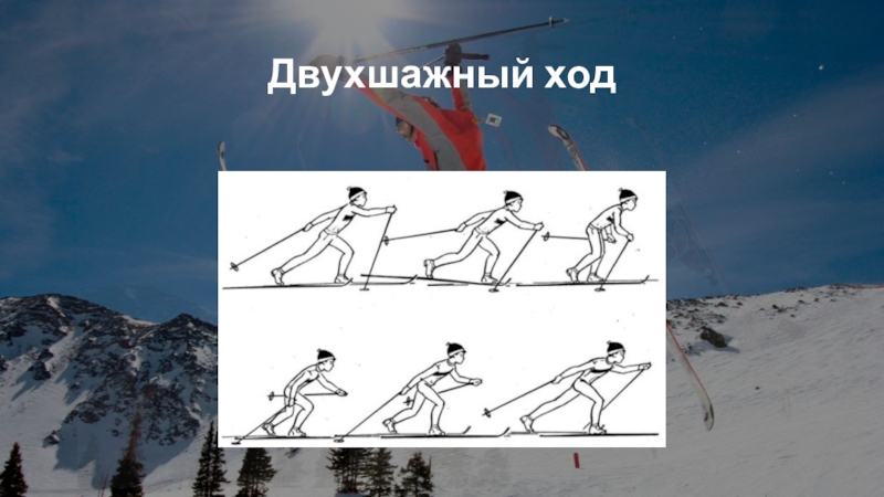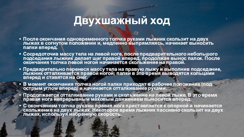 Двухшажный ходПосле окончания одновременного толчка руками лыжник скользит на двух лыжах в согнутом положении и, медленно выпрямляясь,