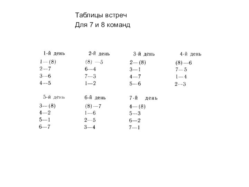 Таблицу для любого числа команд можно составить самостоятельно. Число играющих команд делят пополам и пишут столбиками цифры, начиная со второй половины, причем если число команд-участниц нечетное, то на 2 делят очередную четную цифру. Например, играют 7 команд. Следующую за 7-й четную цифру 8 делят на 2 и пишут столбиком цифры, начиная со второй половины, т. е. с 5: