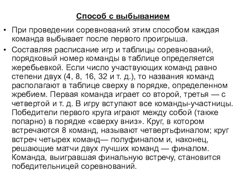 Составляя расписание игр и таблицы соревнований, порядковый номер команды в таблице определяется жеребьевкой. Если число участвующих команд равно степени двух (4, 8, 16, 32 и т. д.), то названия команд располагают в таблице сверху в порядке, определенном жребием. Первая команда играет со второй, третья — с четвертой и т. д. В игру вступают все команды-участницы. Победители первого круга играют между собой (также попарно) в порядке «сверху вниз». Круг, в котором встречаются 8 команд, называют четвертьфиналом; круг встреч четырех команд— полуфиналом и, наконец, решающие матчи двух лучших команд — финалом. Команда, выигравшая финальную встречу, становится победительницей соревнований.
