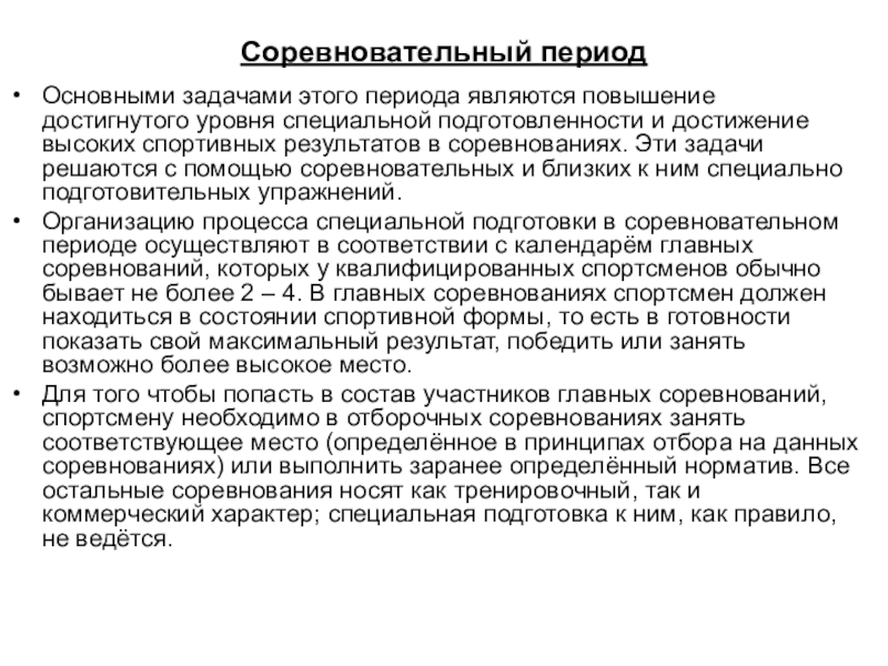 Организацию процесса специальной подготовки в соревновательном периоде осуществляют в соответствии с календарём главных соревнований, которых у квалифицированных спортсменов обычно бывает не более 2 – 4. В главных соревнованиях спортсмен должен находиться в состоянии спортивной формы, то есть в готовности показать свой максимальный результат, победить или занять возможно более высокое место.