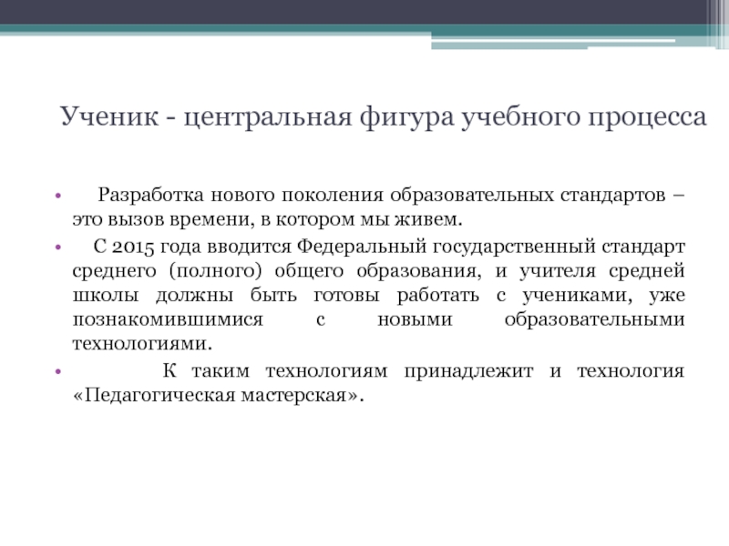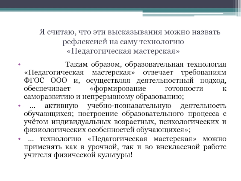 Таким образом, образовательная технология «Педагогическая мастерская» отвечает требованиям ФГОС ООО и, осуществляя деятельностный подход, обеспечивает «формирование готовности к саморазвитию и непрерывному образованию;