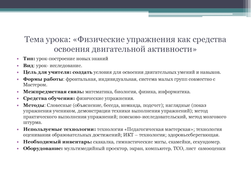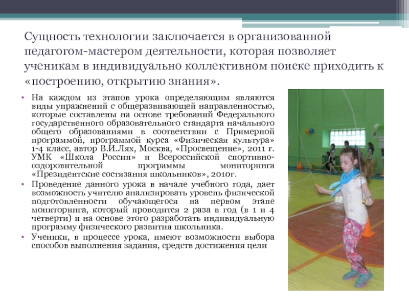 На каждом из этапов урока определяющим являются виды упражнений с общеразвивающей направленностью, которые составлены на основе требований Федерального государственного образовательного стандарта начального общего образованиями в соответствии с Примерной программой, программой курса «Физическая культура» 1-4 класс, автор В.И.Лях, Москва, «Просвещение», 2011 г. УМК «Школа России» и Всероссийской спортивно-оздоровительной программы мониторинга «Президентские состязания школьников», 2010г.