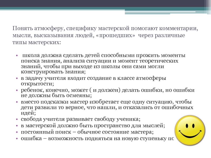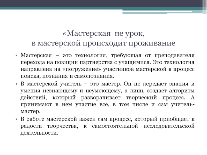 принцип приоритета процесса учения над его результатом. В мастерской важен не только и не столько результат творческого поиска, сколько сам его процесс, в котором участники идут к истине методом проб и ошибок. При этом обеспечиваются условия для усвоения предметного знания;