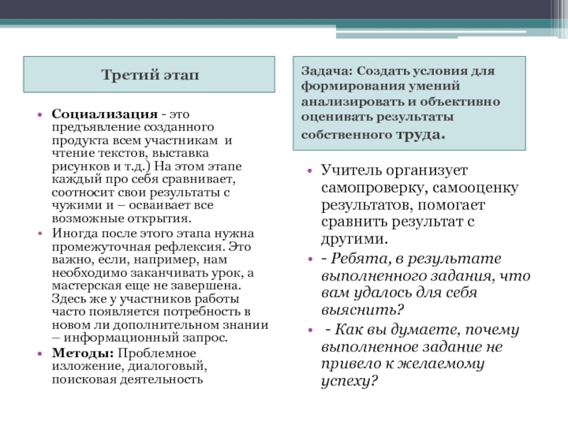 Социализация - это предъявление созданного продукта всем участникам и чтение текстов, выставка рисунков и т.д.) На этом этапе каждый про себя сравнивает, соотносит свои результаты с чужими и – осваивает все возможные открытия.