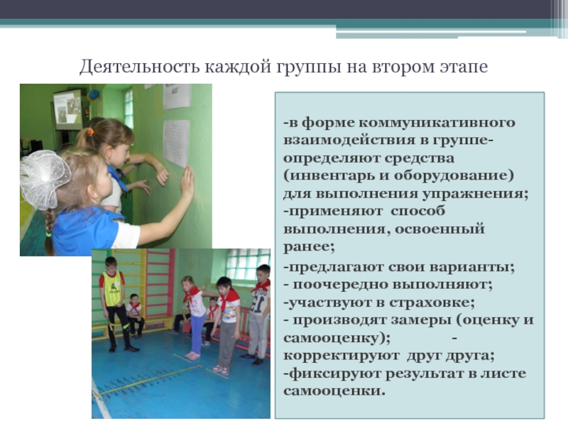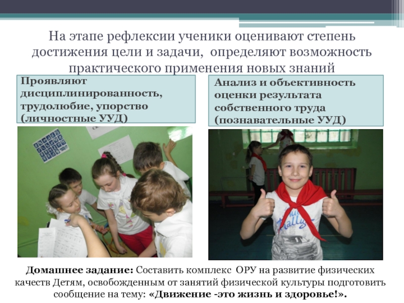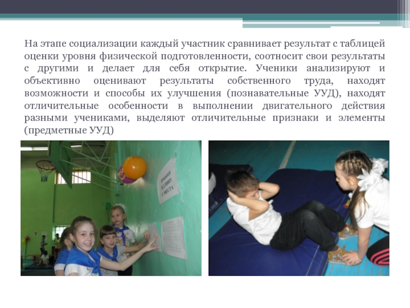Это происходит на основе соотнесения и сравнения учащимися своего результата, с тем, что сделали одноклассники в группе, а также с общей таблицей результатов уровня физической подготовленности. В результате такого соотнесения вырабатывается собственное понимание того, что к достижению определенной цели можно подойти своим способом.