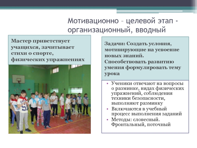 Урок строится на принципах деятельностного обучения: принцип равенства всех участников образовательного процесса. Мастер работает вместе со всеми, равен ученику в поиске знаний. Он не спешит отвечать на вопросы, а дает возможность выполнить упражнение несколько раз, обнаружив потребность в ней у учащихся;