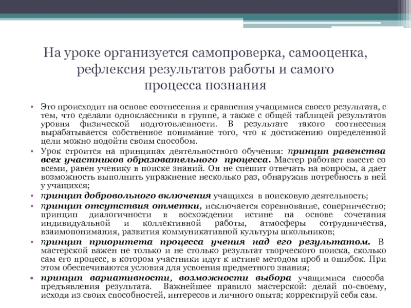 принцип отсутствия отметки, исключается соревнование, соперничество; принцип диалогичности в восхождении истине на основе сочетания индивидуальной и коллективной работы, атмосферы сотрудничества, взаимопонимания, развития коммуникативной культуры школьников;