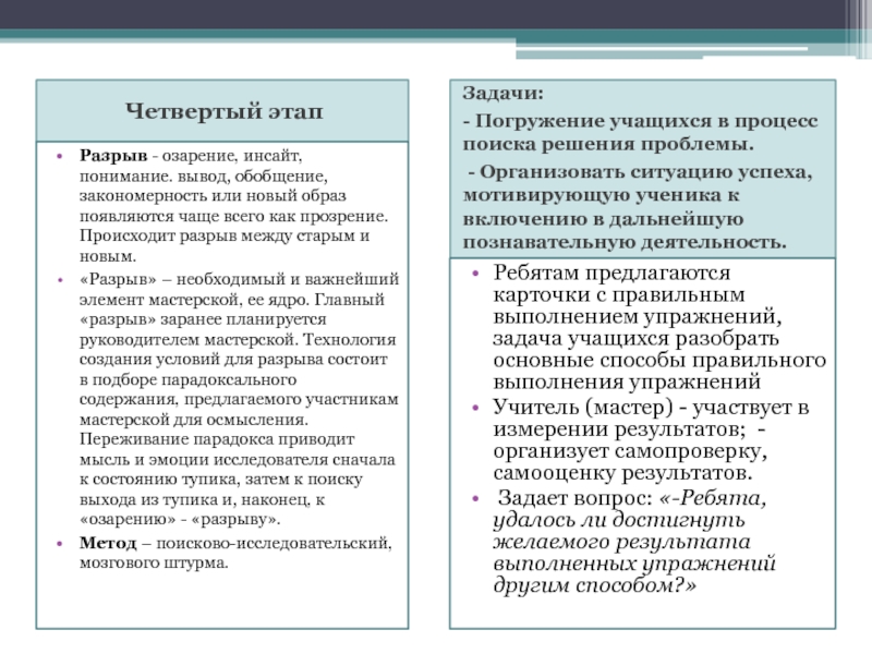 «Разрыв» – необходимый и важнейший элемент мастерской, ее ядро. Главный «разрыв» заранее планируется руководителем мастерской. Технология создания условий для разрыва состоит в подборе парадоксального содержания, предлагаемого участникам мастерской для осмысления. Переживание парадокса приводит мысль и эмоции исследователя сначала к состоянию тупика, затем к поиску выхода из тупика и, наконец, к «озарению» - «разрыву».