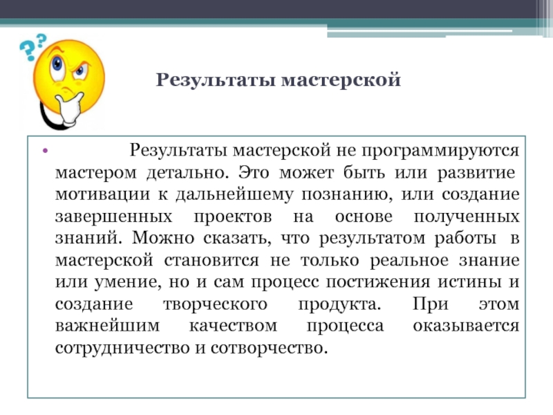 принцип вариативности, возможности выбора учащимися способа предъявления результата. Важнейшее правило мастерской: делай по-своему, исходя из своих способностей, интересов и личного опыта; корректируй себя сам.