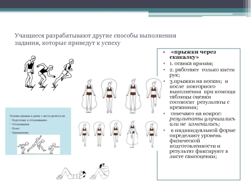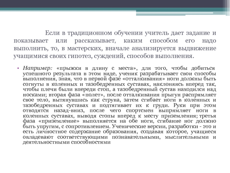 Например: «прыжки в длину с места», для того, чтобы добиться успешного результата в этом виде, ученик разрабатывает свои способы выполнения, зная, что в первой фазе «отталкивания» ноги должны быть согнуты в коленных и тазобедренных суставах, наклоняясь вперед так, чтобы плечи были впереди стоп, а тазобедренный сустав находился над носками; вторая фаза «полет», после отталкивания прыгун распрямляет свое тело, вытянувшись как струна, затем сгибает ноги в коленных и тазобедренных суставах и подтягивает их к груди. Руки при этом отводятся назад-вниз, после чего спортсмен выпрямляет ноги в коленных суставах, выводя стопы вперед к месту приземления; третья фаза «приземление» выполняется на обе ноги, сгибание ног должно быть упругим, с сопротивлением. Ученические версии, разработки - это и есть личностное содержание образования, создавая которое, учащиеся овладевают соответствующими познавательными, мыслительными и деятельностными способностями