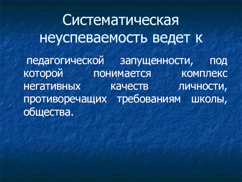 Систематическая неуспеваемость ведет к 	педагогической запущенности, под которой понимается комплекс негативных качеств личности, противоречащих требованиям школы, общества.
