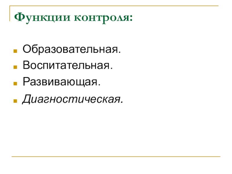 Функции контроля:Образовательная.Воспитательная.Развивающая.Диагностическая.