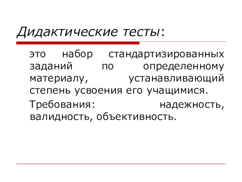 Дидактические тесты:	это набор стандартизированных заданий по определенному материалу, устанавливающий степень усвоения его учащимися.	Требования: надежность, валидность, объективность.