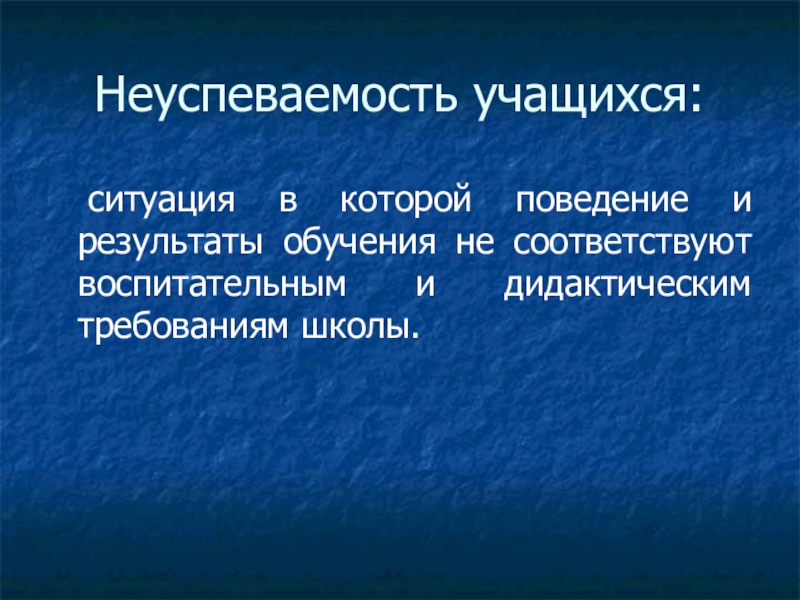 Неуспеваемость учащихся:	ситуация в которой поведение и результаты обучения не соответствуют воспитательным и дидактическим требованиям школы.