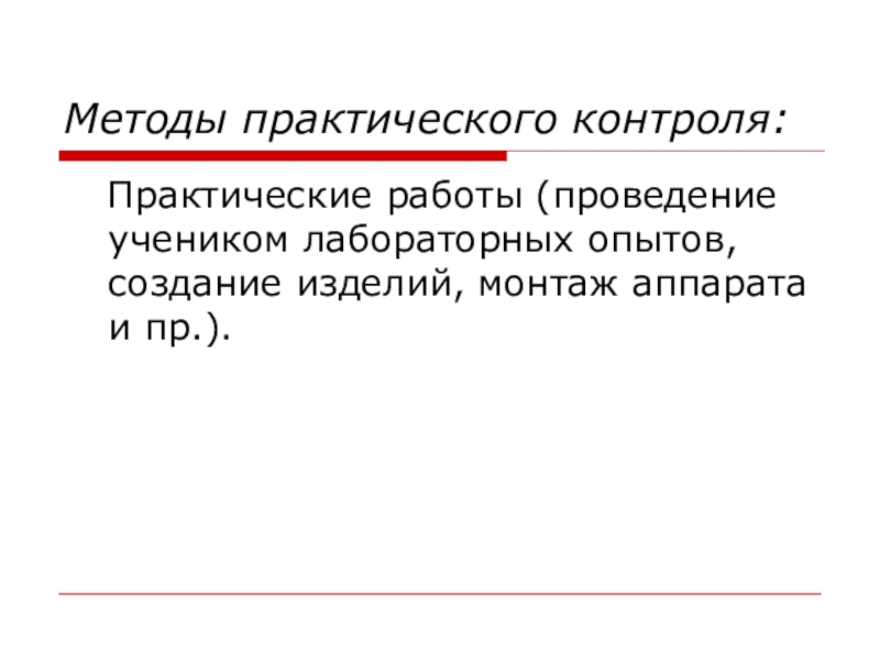 Методы практического контроля:	Практические работы (проведение учеником лабораторных опытов, создание изделий, монтаж аппарата и пр.).