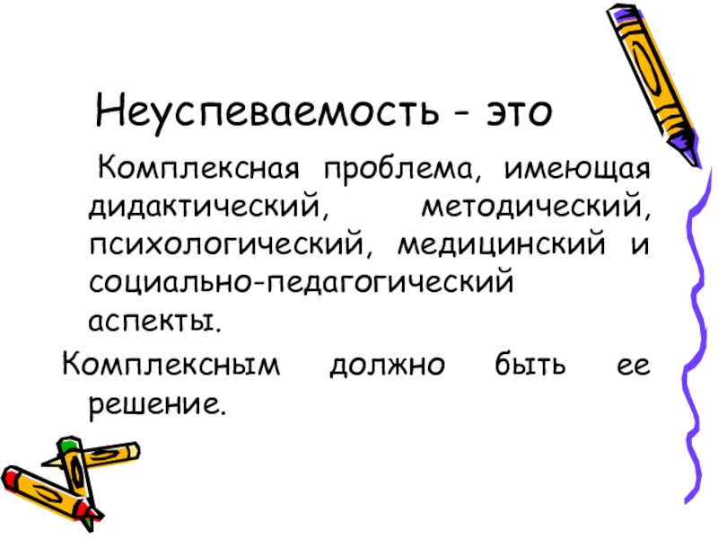 Неуспеваемость - это	Комплексная проблема, имеющая дидактический, методический, психологический, медицинский и социально-педагогический аспекты.Комплексным должно быть ее решение.