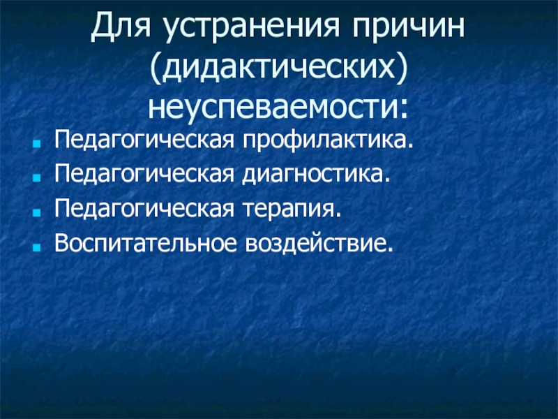 Для устранения причин (дидактических) неуспеваемости:Педагогическая профилактика.Педагогическая диагностика.Педагогическая терапия.Воспитательное воздействие.