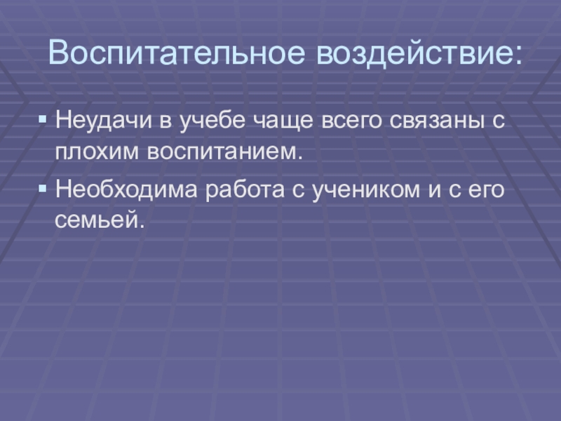 Воспитательное воздействие:Неудачи в учебе чаще всего связаны с плохим воспитанием.Необходима работа с учеником и с его семьей.