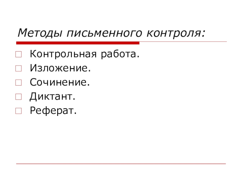 Методы письменного контроля:Контрольная работа.Изложение.Сочинение.Диктант.Реферат.