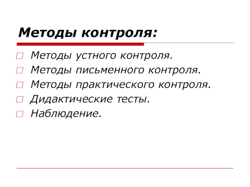 Методы контроля:Методы устного контроля.Методы письменного контроля.Методы практического контроля.Дидактические тесты.Наблюдение.