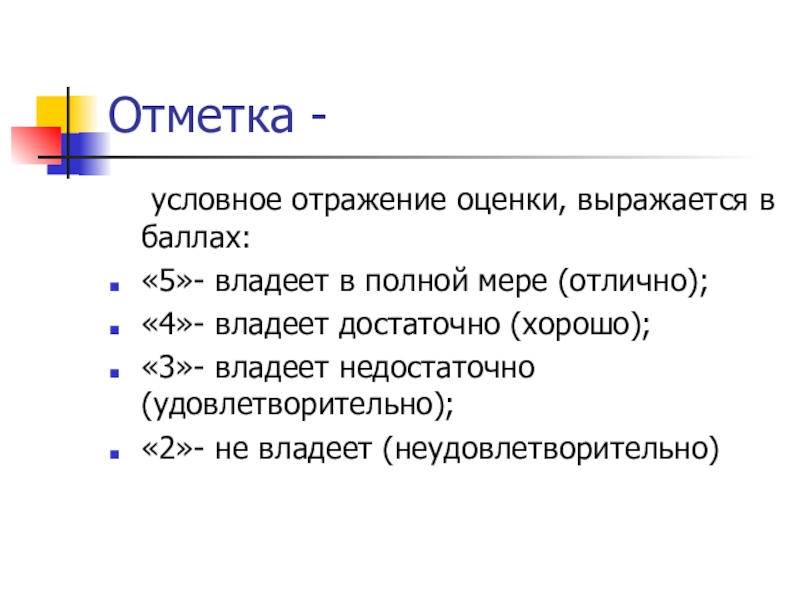 Отметка - 	условное отражение оценки, выражается в баллах:«5»- владеет в полной мере (отлично);«4»- владеет достаточно (хорошо);«3»- владеет