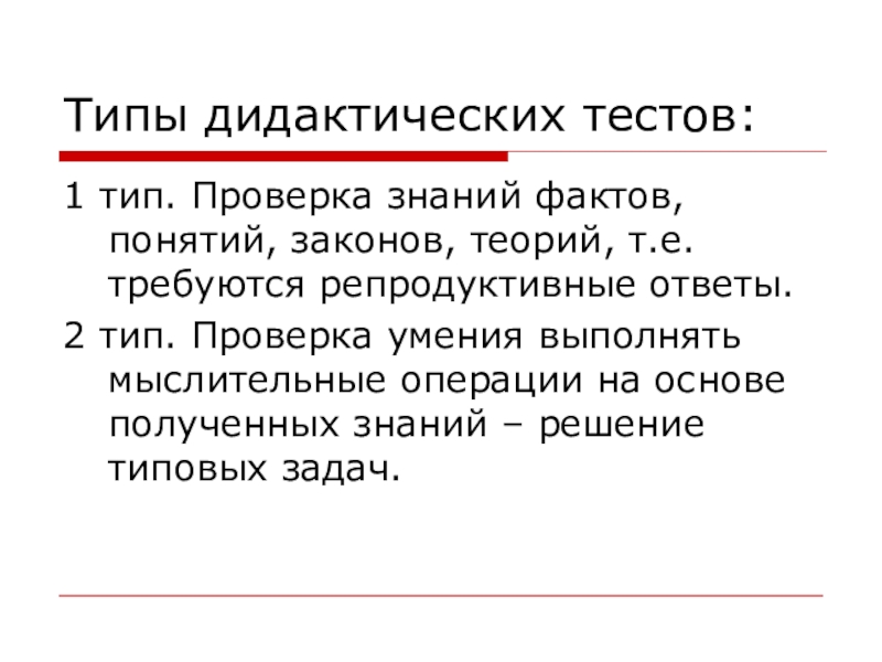 Типы дидактических тестов:1 тип. Проверка знаний фактов, понятий, законов, теорий, т.е. требуются репродуктивные ответы.2 тип. Проверка умения
